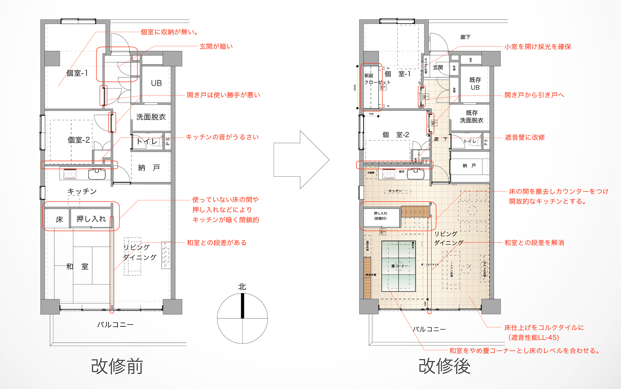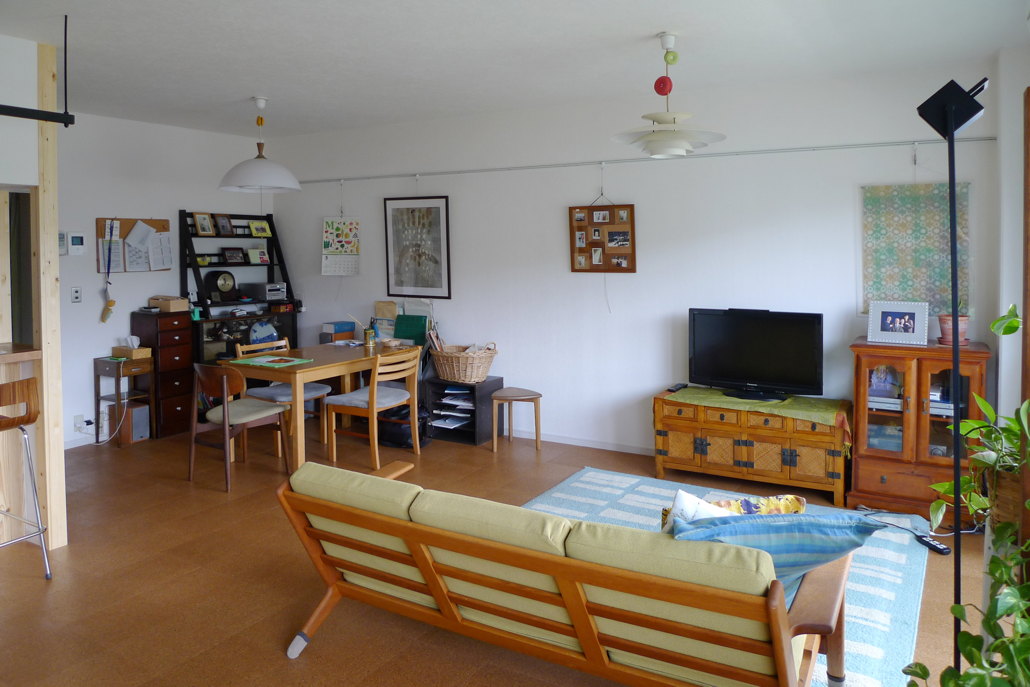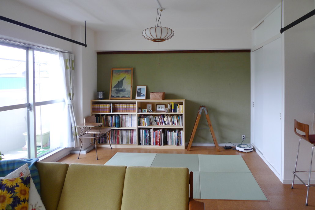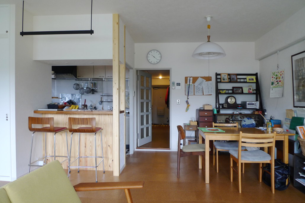 | Comment | 築約25年のマンションリフォームです。あまり有効に使われていない和室をリビングと一体化し明るい空間としました。また、かつて和室の押入れであった部分にキッチンとリビングをつなぐカウンターを設け、カウンターの開口部分からキッチンへ南側からの明るさが届くようにしています。 さらに、床仕上げは天然コルク仕上げとし、一部アクセントとして設けた畳コーナーは、お客様のための布団を敷くスペースとしても使用できます。 |